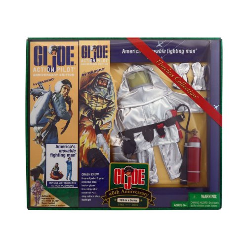 PRODUCT DESCRIPTIONS:This 40th Anniversary set includes a reproduction of the original Action Pilot figure with crash crew accessories. The set includes a "fireproof" jacket and pants, a protective hood, boots gloves, a fire extinguisher, a crash belt, an axe, a strap cutter, pliers, and a flashlight. The figure's coffin box comes with a 12-inch figure in a fatigue uniform, a PVC fatigue hat, boots, dog tags, an Air Force manual, and an insignias sheet. This is the 19th set in the 40th Anniversary series.
