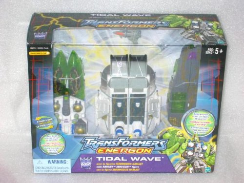 PRODUCT DESCRIPTIONS:TIDAL WAVE is one of the LARGEST Decepticon warriors with a weapons arsenal as menacing as his size. His continued exposure to raw energon caused excessive damage to various parts of his body. These damaged parts were eventually replaced with pure energon, boosting Tidal Wave's strength and making him nearly invincible. He transforms into a powerful battleship and is able to unleash a full-scale assault on his enemies from a single location. Although he is massive and powerful, Tidal Wave's lack of intelligence prevents him from becoming a true Decepticon leader.