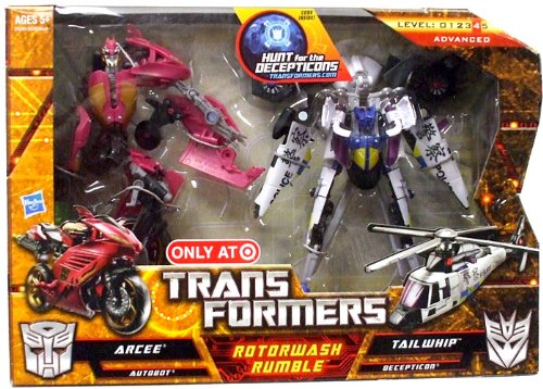 PRODUCT DESCRIPTIONS:Not even the most powerful AUTOBOT can resist being pinned by the full force of the wind generated by TAILWHIP when he hovers. He creates a vortex beneath him strong enough to crush most human vehicles. AUTOBOTS are helpless in his rotor wash. ARCEE twists and struggles to bring her weapons to bear, because her only chance is to land a solid hit on the blades of the evil robot above her. A head-to-head battle is about to go down! These two mighty "metallic" robot warriors are fearsome fighters with powerful "weapons" to back them up. Your heroic ARCEE figure features spinning gears and an extending "blade" to try to keep her enemy from advancing. But your villainous TAILWHIP figure has a surprise of his own - a spinning combat blade accessory! As the combat heats up, convert your TAILWHIP figure to helicopter vehicle mode with push-button spinning rotor to flee by "air". Then, convert your ARCEE figure to motorcycle vehicle mode with a sidecar than can become a snap-on cannon accessory when she catches up to her opponent. Every new battle is one more step toward winning the war! Two-pack includes ARCEE and TAILWHIP figures.
